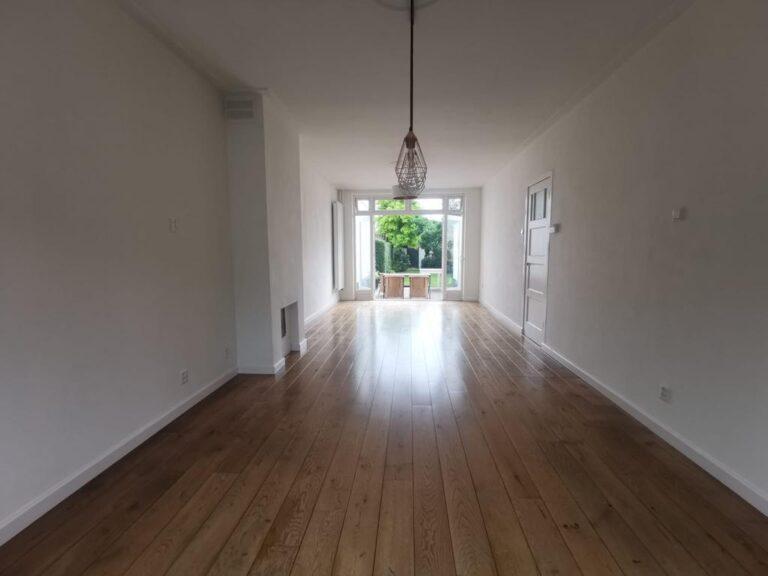 Sfeervolle, ruime woonkamer met houten vloer, stucwerkplafond v.v. een lijst, stucwerkwanden en openslaande deuren naar de tuin. Er is een mogelijkheid tot aansluiting van een houtkachel in de woonkamer. De voorzijde van de woning is voorzien van een erker. De woonkamer heeft veel lichtinval door de vele raampartijen.