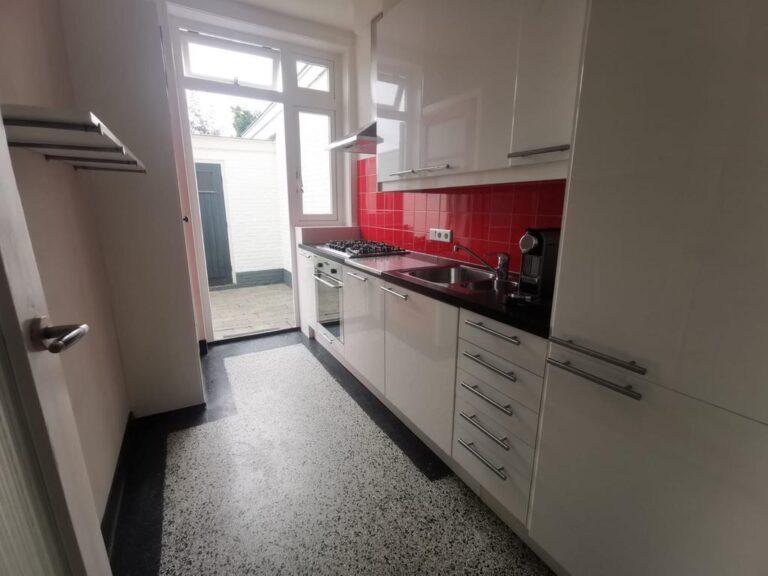 Moderne, wit hoogglans keuken (bj. 2007) met kunststof aanrechtblad, koel/vriescombi, vaatwasser, gaskookplaat, terrazzovloer en inbouwkast. Via de keuken heeft u ook toegang tot de mooie achtertuin.