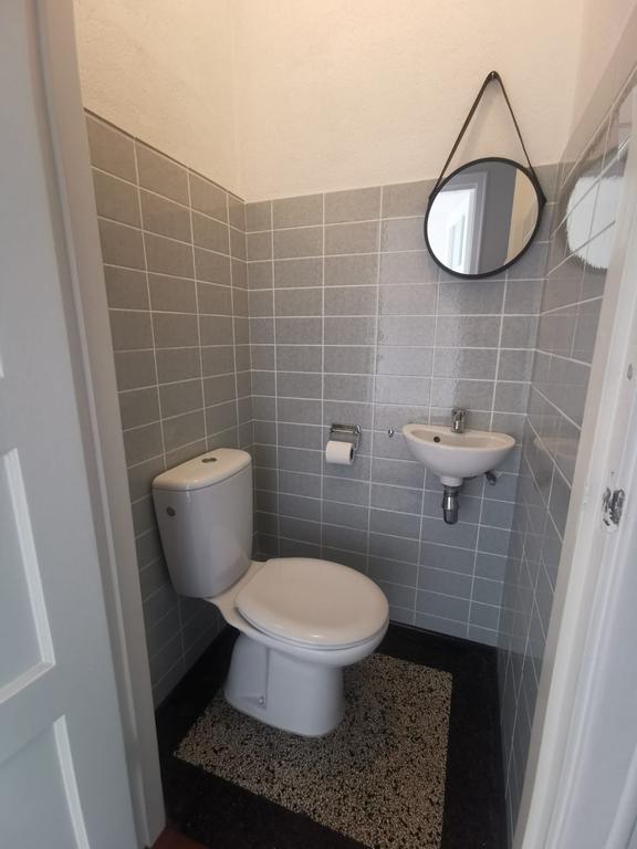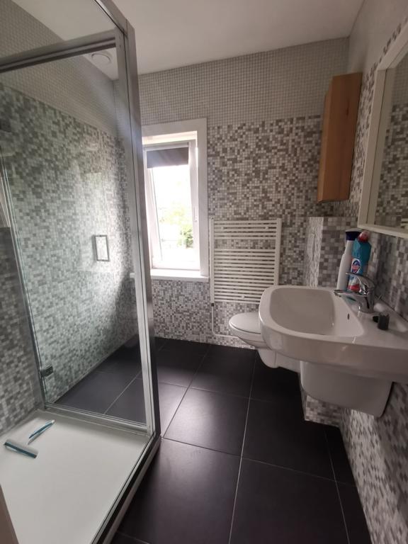 Moderne, geheel betegelde badkamer (bj. 2007). Voorzien van wastafel, douche, toilet en design radiator.