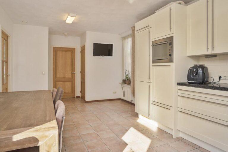 De ruime leefkeuken is vanuit de hal en de woonkamer bereikbaar. Er is een lichte keuken met granieten werkblad in hoekopstelling geplaatst, deze beschikt over een 5-pits kookplaat en afzuigkap, koelkast en aparte vriezer, een combimagnetron en een vaatwasser die op praktische hoogte geplaatst is. Naast al de bergruimte die de keuken zelf heeft, tref je in de keuken ook de toegang aan tot de verdiepte trapkast met enorm veel opslagruimte.