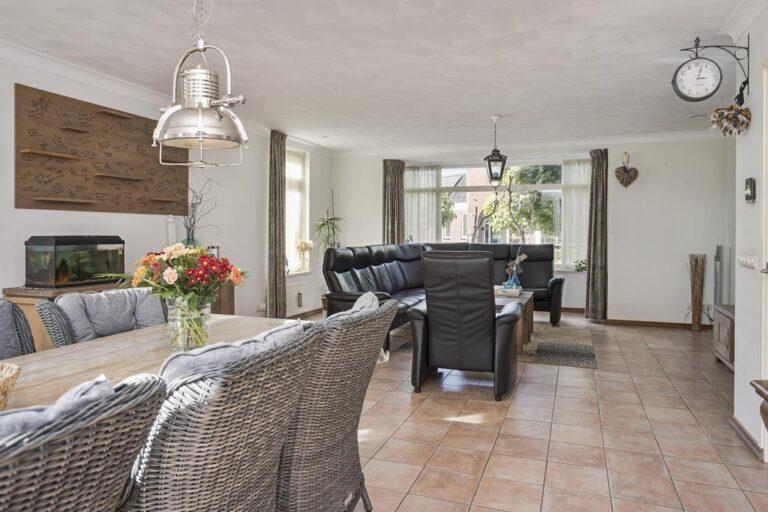 Vanuit de hal aan de voorzijde van de woning heb je toegang tot de keuken en de woonkamer. De ruime woonkamer is aan de voorzijde voorzien van een erker en aan de achterzijde van openslaande deuren naar de heerlijke tuin. Ook aan de lange zijde van de woonkamer vind je 2 ramen waardoor de woonkamer heerlijk licht is. De woonkamer heeft gestukte wanden en een schuurwerk plafond. De vloer is voorzien van een tegelvloer met vloerverwarming. Heerlijk comfortabel!
