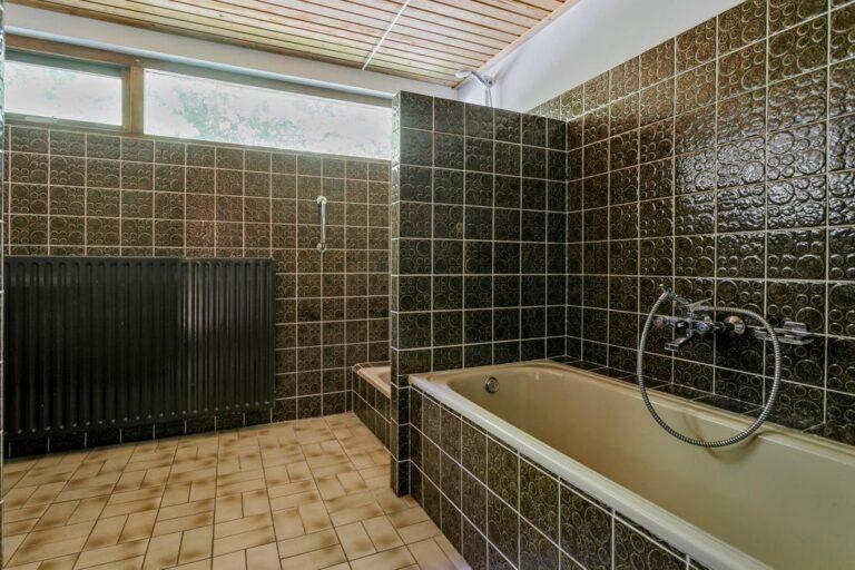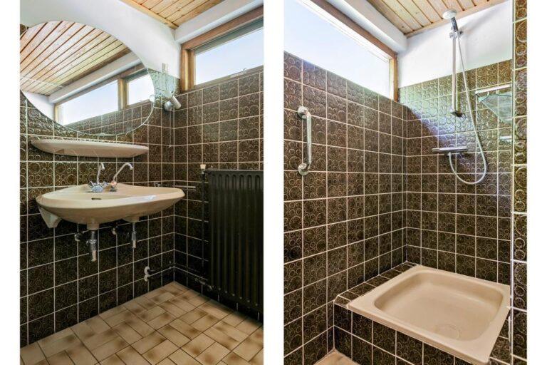 Aan de voorzijde van de woning vinden we de badkamer, deze is van goed formaat en biedt ruimte aan zowel een ligbad als een douche en een dubbele wastafel. De toiletruimte is separaat, te bereiken vanaf de overloop.