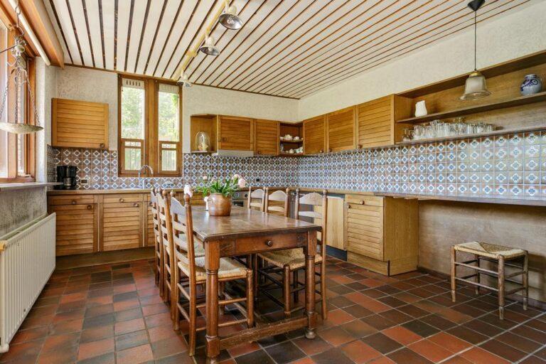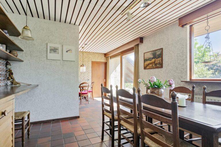 Een enorm ruime zitkamer met gezellige openhaard en fraai zicht op het park die in open verbinding staat met de eetkamer die weer prachtig uitkijkt op de grote tuin. De eetkamer staat in open verbinding met de ruime woonkeuken. Vanuit de eetkamer hebben we toegang tot de tuin en bijkeuken.