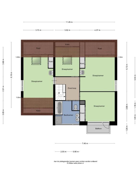 De trap vanuit de woonkamer brengt ons op de overloop van verdieping één. De overloop geeft toegang tot liefst 4 slaapkamers, waarvan 3 ruim, en de badkamer. De slaapkamer aan de voorzijde beschikt over een balkonnetje en de meeste kamers hebben een vaste kastenwand.