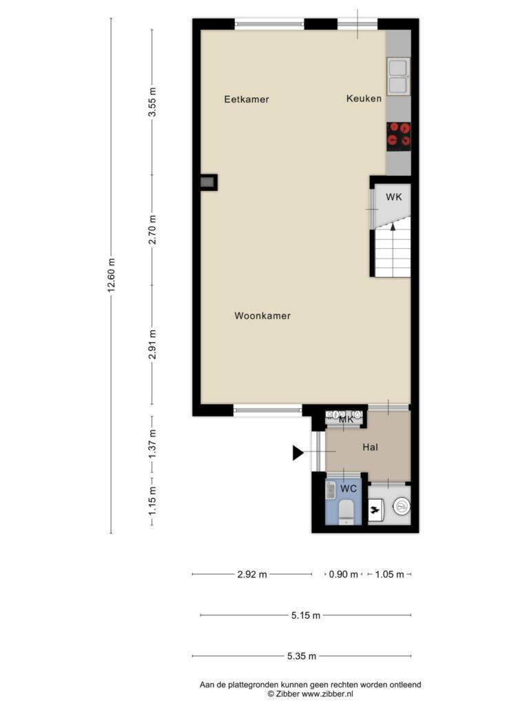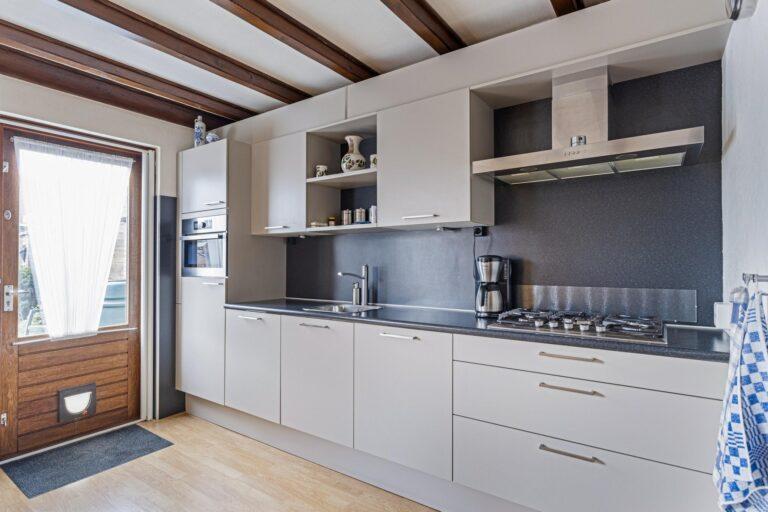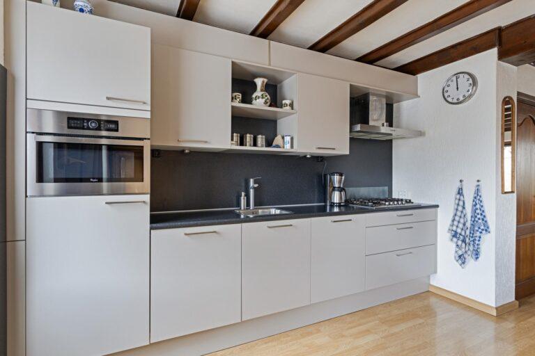 Bij binnenkomst word je verwelkomd in de hal, waar zich het toilet en de provisieruimte bevinden. De lichte woonkamer met open haard straalt warmte en gezelligheid uit. De open keuken is voorzien van moderne apparatuur en biedt middels de achterdeur toegang tot de zonnige achtertuin.