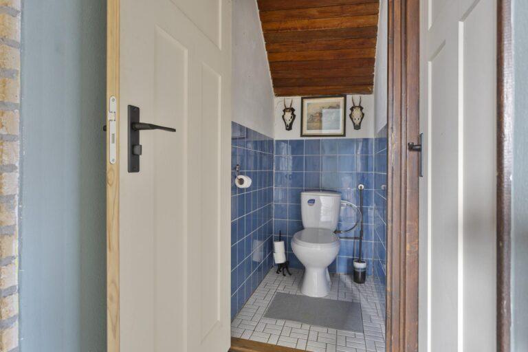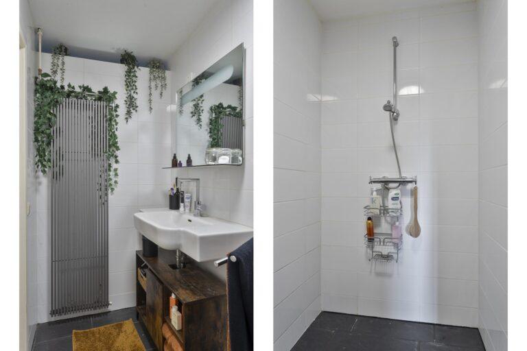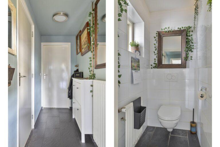 Grenzend aan de keuken bevindt zich de gang naar de praktische bijkeuken/ berging, waar extra opslagruimte is en waar je witgoedapparatuur kunt plaatsen. Vanuit de gang is kom je in de badkamer, die is uitgerust met een inloopdouche en wastafel, en een apart toilet en de achterdeur naar buiten.