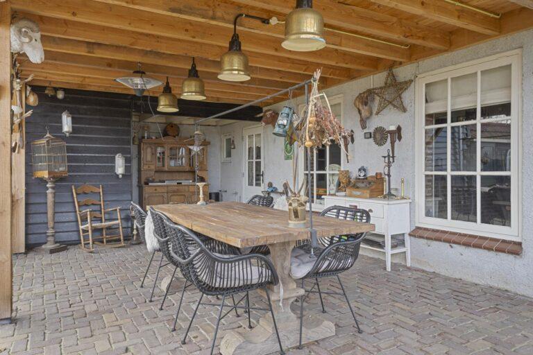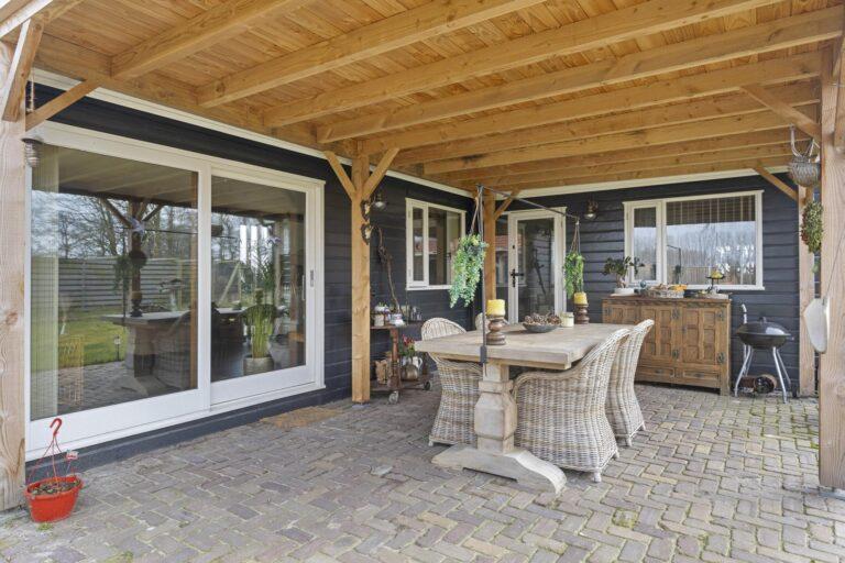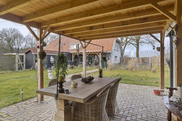 Het is heerlijk vertoeven aan de achterzijde van de woning onder de ruime gezellige overkapping van 3×6 meter, perfect om beschut te kunnen genieten van de tuin. Aangrenzend aan de overkapping staat een houten berging.