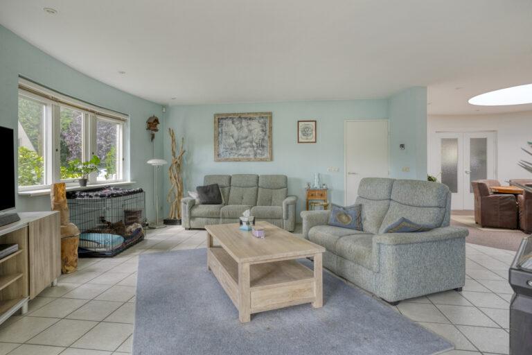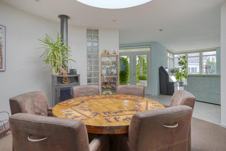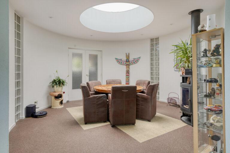 De woonkamer is ruim en geniet van veel daglicht dankzij grote raampartijen. De open verbinding met de centraal gelegen eetkamer – met lichtkoepel en houtkachel – maakt deze ruimte perfect voor gezellige avonden.