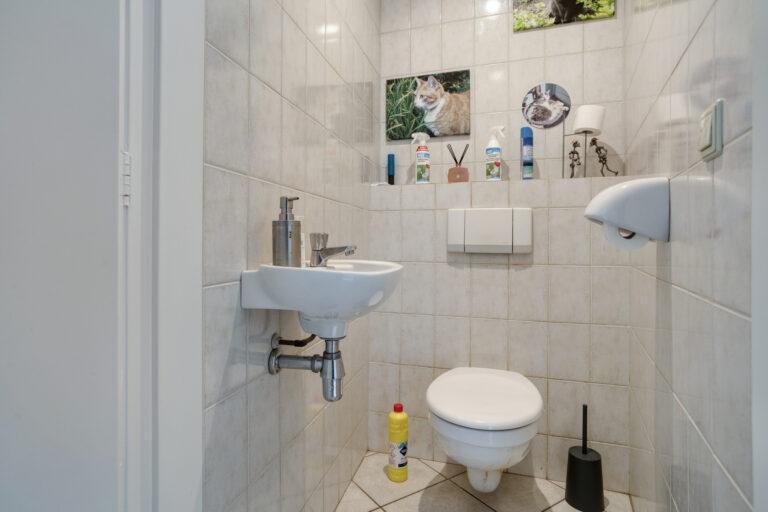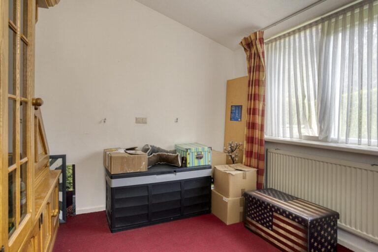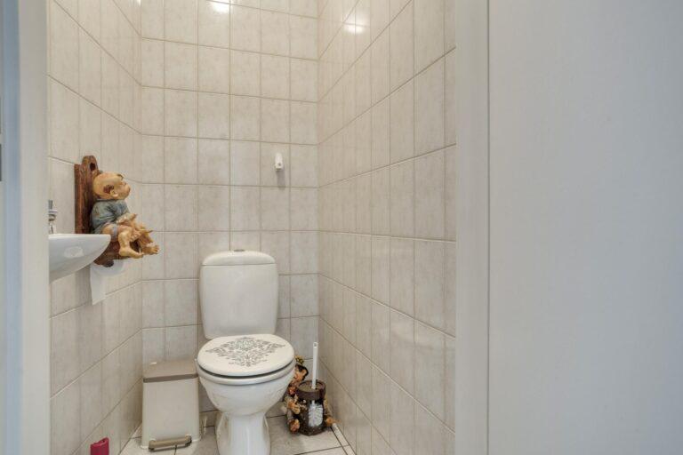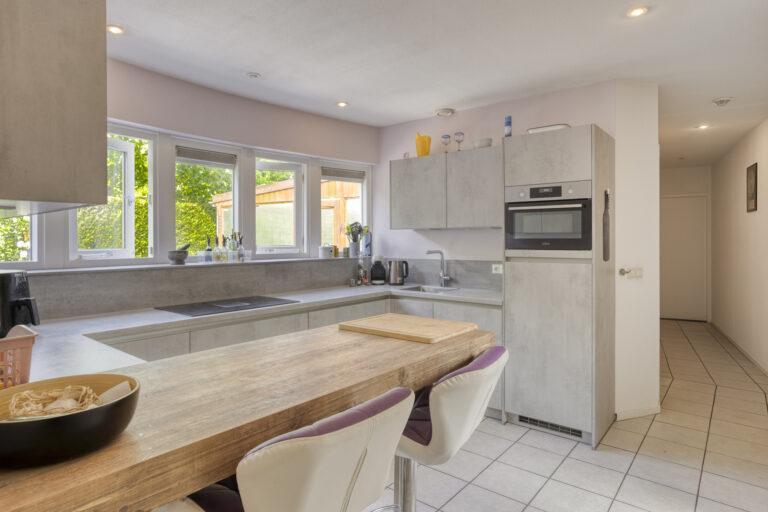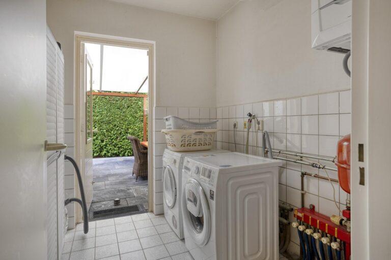 Grenzend aan de keuken ligt de praktische bijkeuken met witgoedaansluitingen, cv-installatie (Remeha, 2024) en extra bergruimte. Vanuit hier bereikt u de overkapping in de tuin.