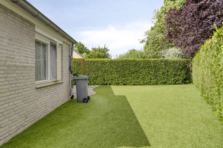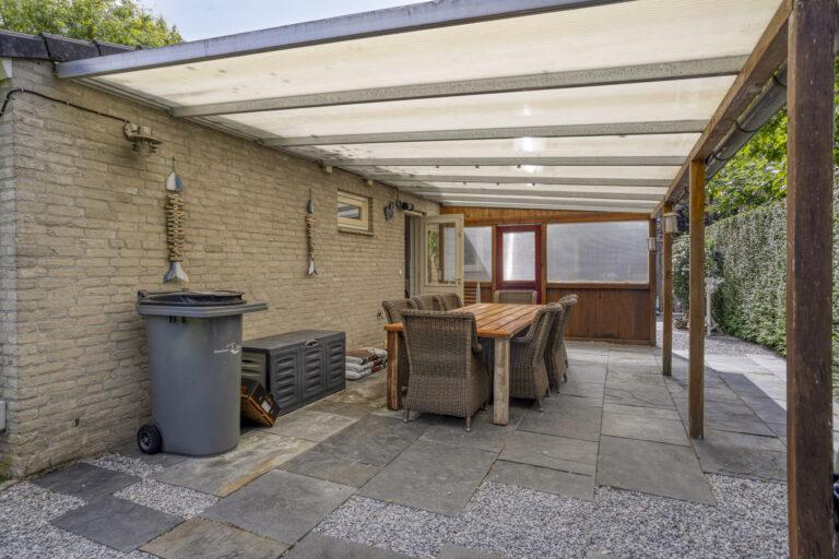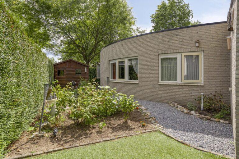 De tuin loopt rondom de woning en biedt meerdere zitplekken in de zon en schaduw. Aan de achterzijde bevindt zich een royale overkapping van ca. 20 m², ideaal om het hele jaar door van uw tuin te genieten. Verder vindt u hier een vrijstaande houten berging, een achterom en onderhoudsvriendelijk kunstgras.