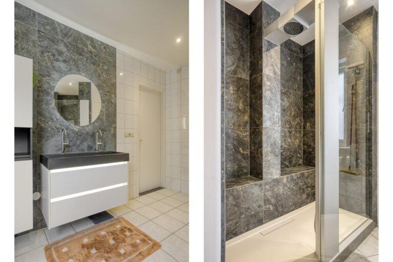 Alle vier de slaapkamers liggen op de begane grond en zijn voorzien van vloerverwarming. Drie ervan hebben een eigen badkamer met douche en wastafel, wat zorgt voor veel comfort en privacy. De twee separate toiletten zijn volledig betegeld en voorzien van een fonteintje.