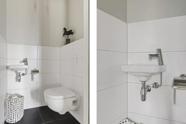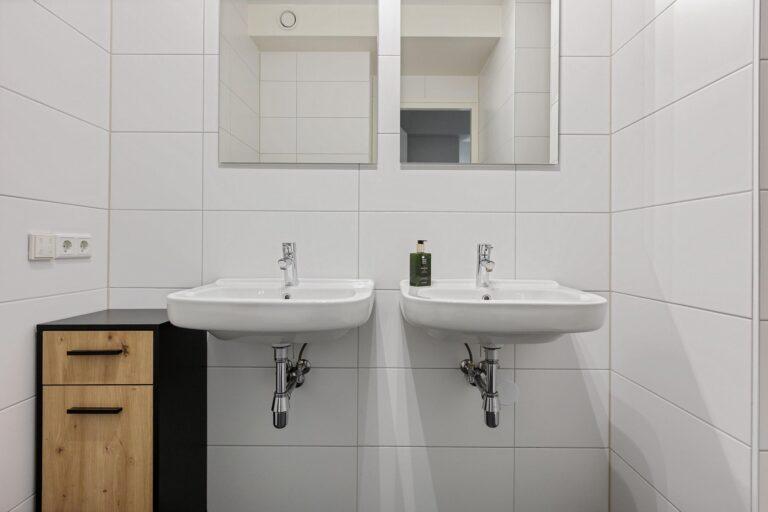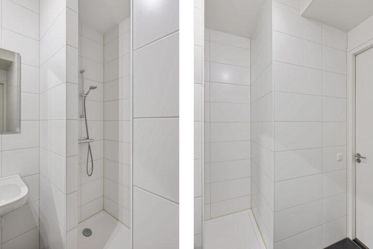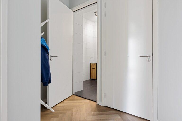 De moderne badkamer is praktisch ingericht met een inloopdouche en dubbele wastafel. Daarnaast is er een separaat toilet en een aparte ruimte voor de technische installaties, aansluitingen voor de wasapparatuur en opslag.