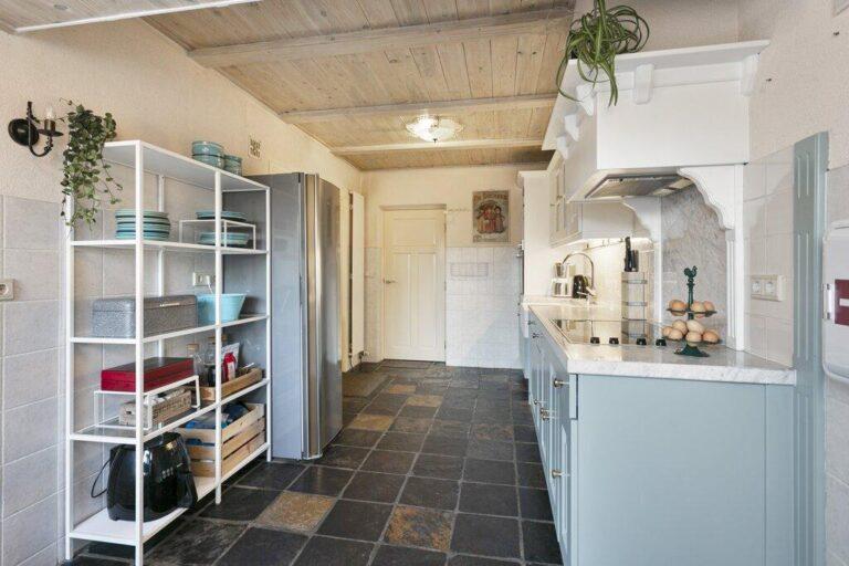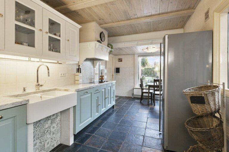 Vanuit de woonkamer hebben we toegang tot de ruime woonkeuken. De fraaie lichtblauwe keukenopstelling is in de lengte geplaatst en heeft een landelijke uitstraling. De uitrusting bestaat uit een elektrische kookplaat met afzuigkap, ruime dubbele spoelbak en combi-oven. De ontbijthoek met zicht op de tuin is de perfecte plek voor een goede start van de dag!