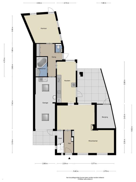 De keuken geeft toegang tot de bijkeuken (met witgoedaansluitingen) welke weer toegang geeft tot de handige kantoor-/hobbyruimte, toiletruimte, badkamer en aangebouwde garage.