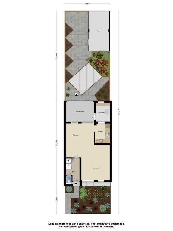 De onderhoudsvriendelijke, op het zuidoosten gelegen tuin is een grotendeels verharde plaats met ruime overkapping direct aan het huis. Aan de zijkanten zijn borders met vaste beplanting. Achter in de tuin vindt u een stenen garage/ berging die plaats biedt voor een auto. Ook bevindt zich hier een achterom, ideaal voor de kinderen of met de kliko’s/ fietsen.