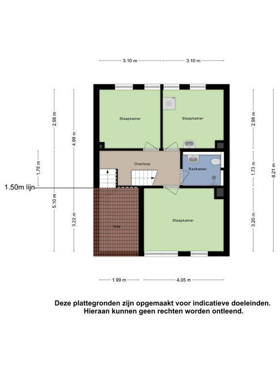 De overloop geeft toegang tot drie ruime slaapkamers en een volledig betegelde badkamer. De slaapkamers zijn voorzien van een laminaat vloer. Eén slaapkamer heeft tevens een eigen wastafel.